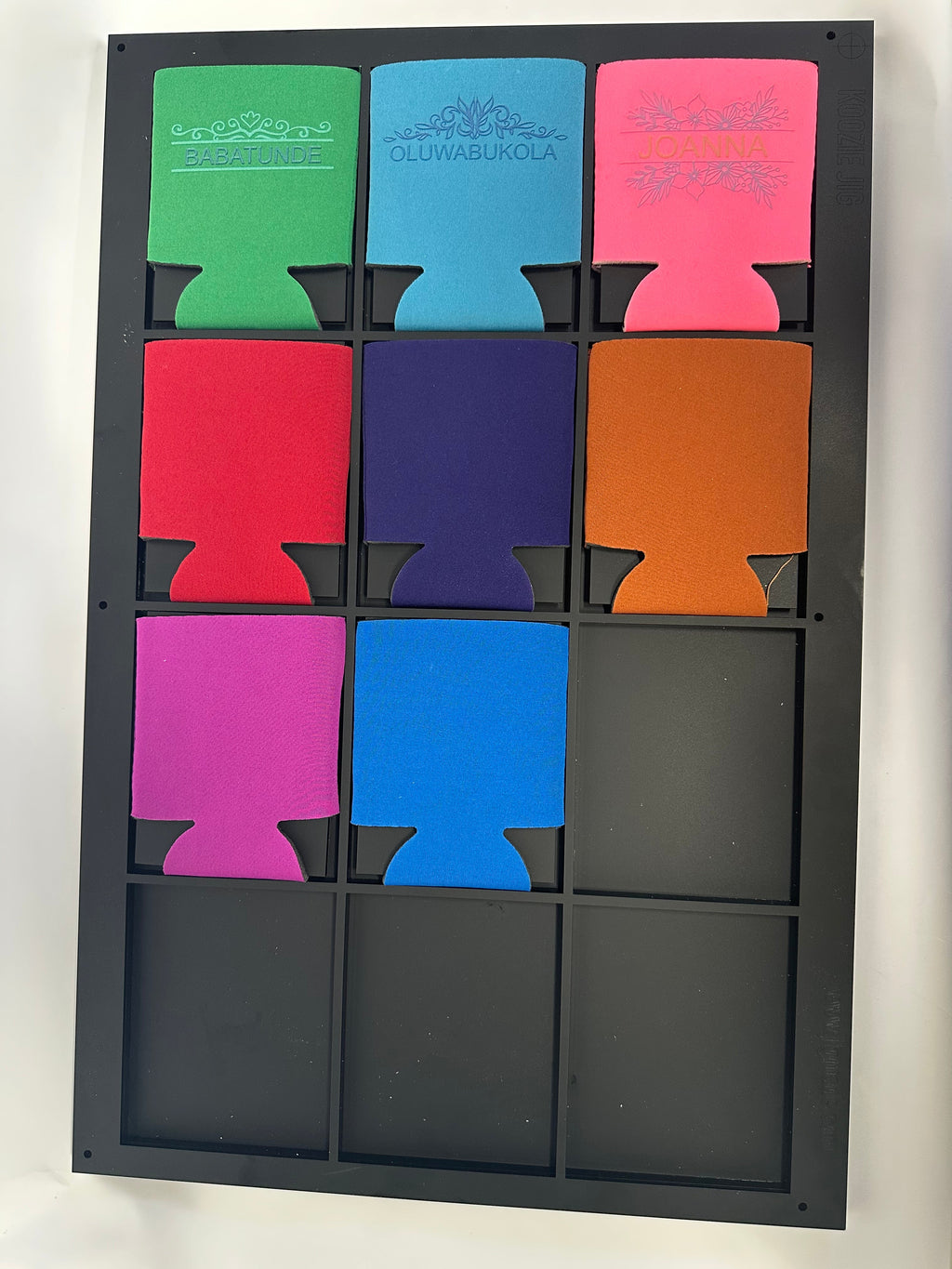 Can cooler sleeves (often neoprene style) can flex, shift, or load slightly differently from piece to piece. A dedicated sleeve jig supports consistent loading so your prints stay straighter and more uniform across a batch, helping reduce reprints, wasted blanks, and time spent measuring.
